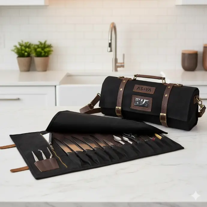 Keep your kitchen tools organized and protected with this durable knife roll! It features genuine leather straps, brass buckles, and 15 slots, making it a practical and stylish gift for both chefs and culinary students. (Read more...)